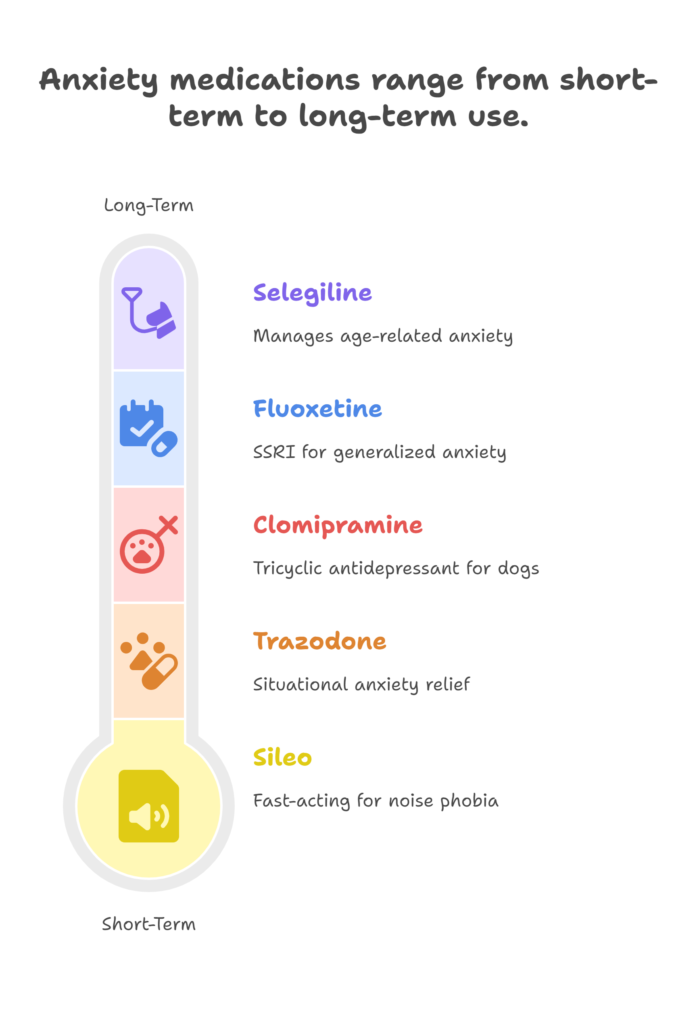 It depends on the medication. SSRIs like fluoxetine or clomipramine may take 4–6 weeks to show full effects. Fast-acting meds like trazodone or Sileo can work within an hour for situational dog anxiety. Your vet will guide you on timing and dosage.